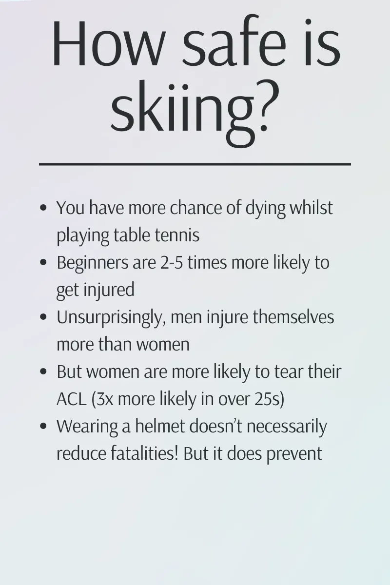 “I went searching for some stats and figures that will either reassure you or confirm that skiing isn’t for you. There’s quite significant variation from different studies. But, on the whole, skiing is no more dangerous than other common sports”.